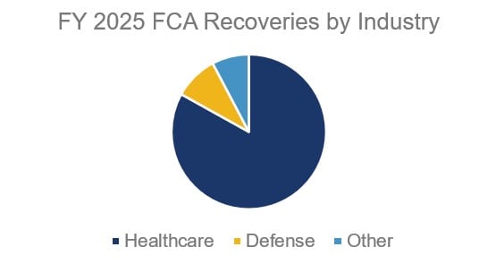 Healthcare and life sciences enforcement dominated FCA recoveries. DOJ reported over $5.7 billion in recoveries in FY25 tied to healthcare matters, compared with $1.8 billion in FY24. Indeed, while the healthcare and life sciences industries generally account for most FCA recoveries, the percentage attributable to healthcare decreased in recent years, including to less than 60% for FY24. That number skyrocketed in FY25, with healthcare and life sciences recoveries accounting for more than 80%.