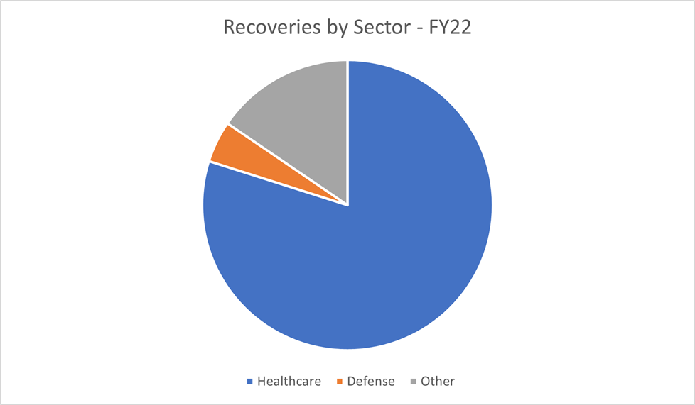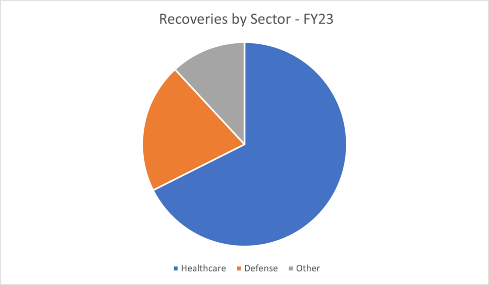 Though FY23 was not particularly notable in terms of total dollars recovered, DOJ did set a record for the number of recoveries, notching 543 separate recoveries. This appears to be due to DOJ’s resolution of numerous, low-dollar value matters related to the Paycheck Protection Program (PPP). In fact, 270 of DOJ’s FY23 resolutions — just shy of half its total for the year — were pandemic-related, netting a total recovery of US$48.3 million, or about $179,000 per matter. The remaining 273 matters resulted in total recoveries of over US$2.6 billion, for an average of US$9.67 million per matter.