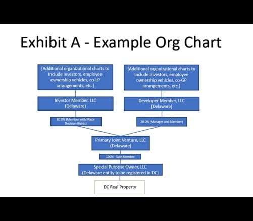 - Our assumption is that the filing entity (Special Purpose Owner, LLC) is required to report each owner meeting the requirement of D.C. Code § 29-102.01, which would include all applicable entities going up the chain of ownership. In the above example, this would mean that at least (i) Primary Joint Venture LLC, (ii) Developer Member and (iii) Investor Member would be considered a greater than 10% owner. In a typical deal structure, additional persons or entities on the Investor Member side (and possibly on the Developer Member side) would also meet this test.